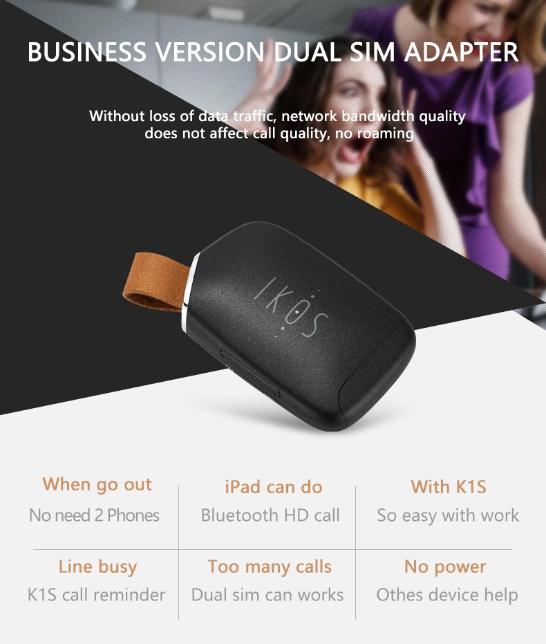 • Features:Sim card adapter, dual sim, dual standbyOne key answerLost alarmPrivacy protectionSelfie control The APP software functional requirementsThe Bluetooth version Support unicom/mobile GSM network, only support calls and text messages, does not support data function.Support calls and SMS cloud service functions, namely: the product is disconnected from the phone , through a cloud service calls and text messages are pushed to the APP client, to prevent drop calls and information. Note: the cloud services need to use the SIM card data traffic!Support for multiple languages (tentative: in Chinese and English).Support the user device via a Bluetooth connection to remind function (App successfully connected, pop-up window within the App shows successful connection).Have lost alarm function, when the product is lost, by mobile phone disconnected for the last time and product when the position of the mobile phone can quickly find the product (this feature requires open mobile location services).Support reading phone original address book functionSupport phone number display equipment, telecommunications operator name and equipment power function. Hardware Function:Through APP the connection to the iOS ,( iOS7.1 system or above).Bluetooth module( 10 meters, Class I).Battery : lithium ,450 MAH, support more than 4 hours and 48 hours standby.Plug the device: SIM card types: NANO SIM card.USB port types: MICRO USB. MODEM Performance Indicators:Types of network: GSMNetwork Band: GSM850MHz EGSM900MHz/DCS1800MHz/PCS1900MHz Package Included:1* IKOS K1S Bluetooth Dual SIM Adapter1* USB Cable1* User Manual